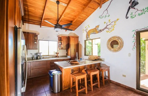 Perched atop the mountain with panoramic views, this 3-bedroom, 2-bath home is a tropical paradise. Relax in the private pool, cook in the fully equipped kitchen, and enjoy A/C throughout. Spacious living areas, a large ranch for outdoor dining, and expansive outdoor spaces invite socializing or quiet relaxation. With ample parking, mountain breezes, and stunning vistas, it’s perfect for families or groups seeking comfort, adventure, and pura vida.